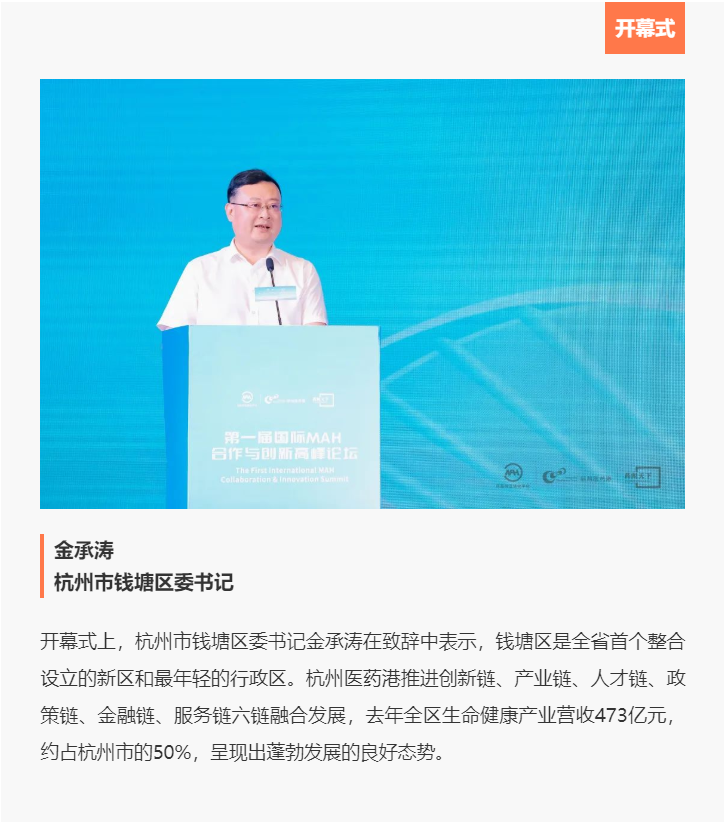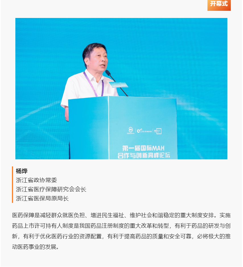 2022年7月22日-23日,由中国药学会、中华全国工商业联合会医药业商会、浙江省药品监督管理局、浙江省医疗保障研究会、杭州市经济和信息化局以及杭州市钱塘区人民政府支持,浙江省药品上市许可持有人转化平台主办的“第一届国际MAH合作与创新高峰论坛(简称“论坛”)”在杭州举行。